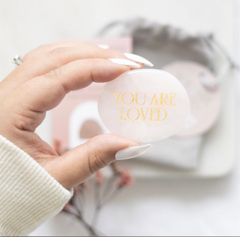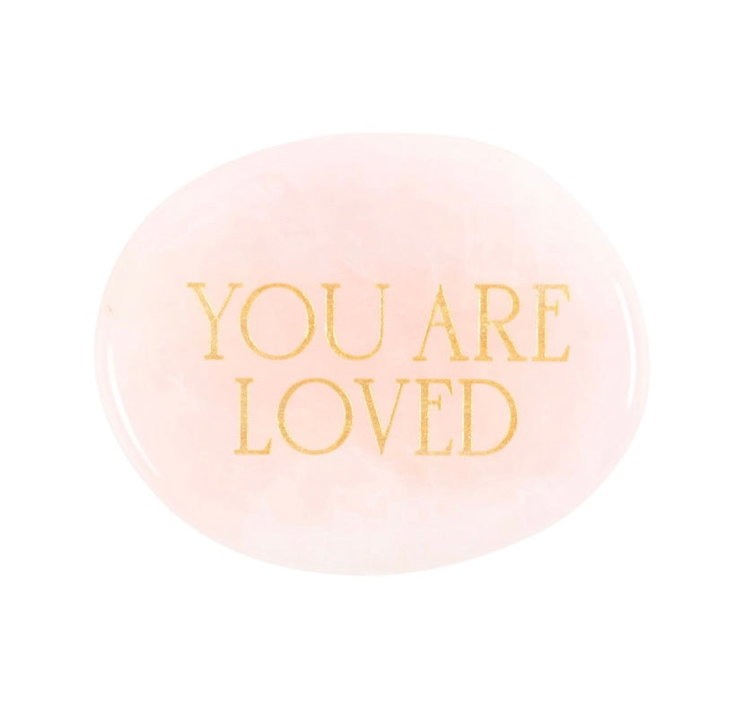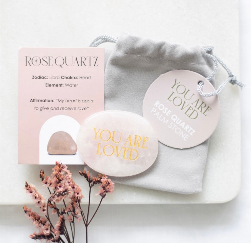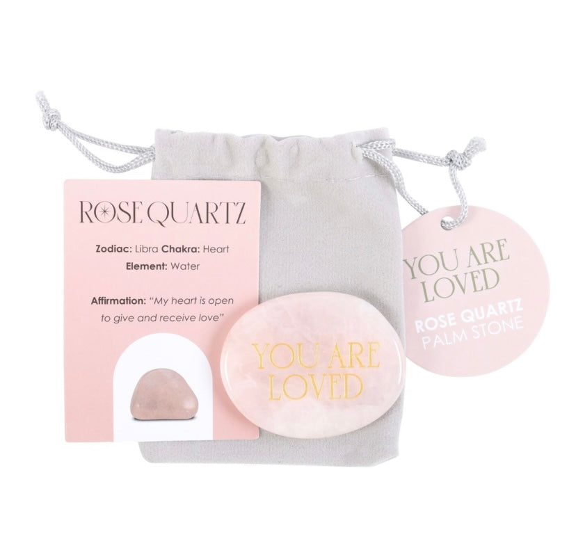 This healing rose quartz palm stone is accented by engraved gold-toned 'you are loved' text, making it a meaningful token of love and care. The stone's compassionate and caring energy enhances its unique healing properties. Presented with an informational insert card and drawstring bag for safekeeping, this gift makes a cherished gesture of love
